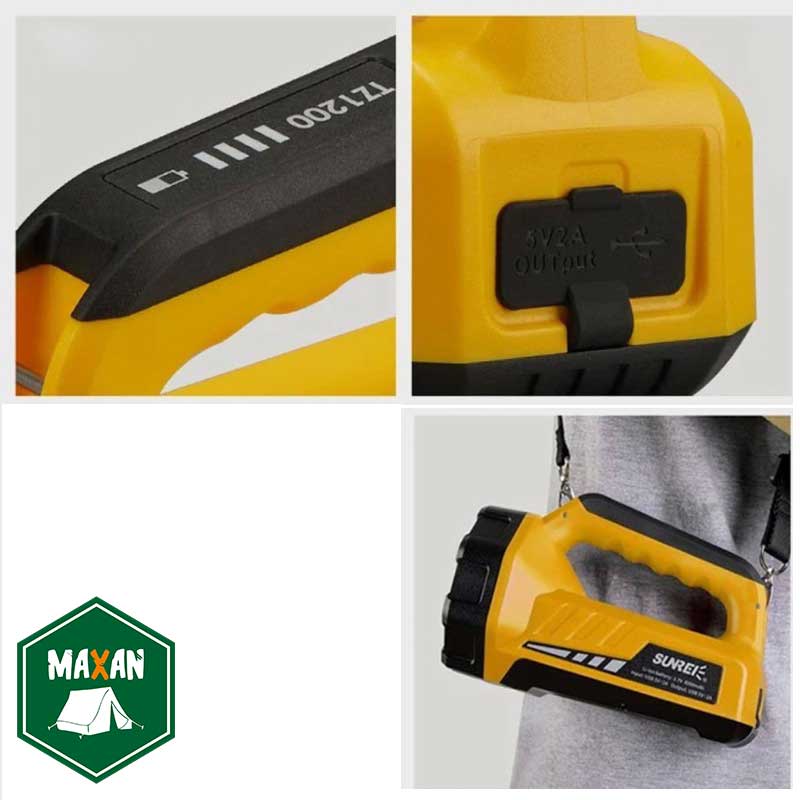 نورافکن SUNREI مدل TZ1200 ابزاری چند منظوره و کاربردی با 3 حالت نوردهی شامل چراغ کمپینگ، چراغ اضطراری (SOSنورقرمز) و نورافکن یا چراغ قوه می باشد. این چراغ نورافکن مجهز به باتری لیتیوم به ظرفیت 10400 میلی آمپر است که کارایی فوق العاده ای داشته و جهت استفاده بهینه از یک کلید دو حالته برای تنظیم شدت نور در 3 حالت کم و زیاد برخوردار می باشد. بدنه این محصول از جنس پلی کربنات و پلاستیک ABS ساخته شده که علاوه بر سبکی باعث ایجاد بالاترین مقاومت در برابر ضربات احتمالی می شود.