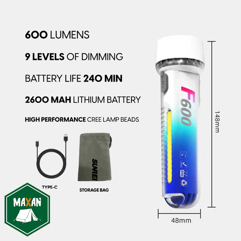 چراغ قوه F600 مجهز به دو حالت نوردهی است: نور متمرکز (فاصله زیاد) و نور پخششدگی (فاصله کوتاه) که برای هر شرایطی مناسب است. با شدت نوری 600 لومن، این چراغ میتواند به راحتی مسیر شما را روشن کند و شما را در تاریکی یاری دهد.