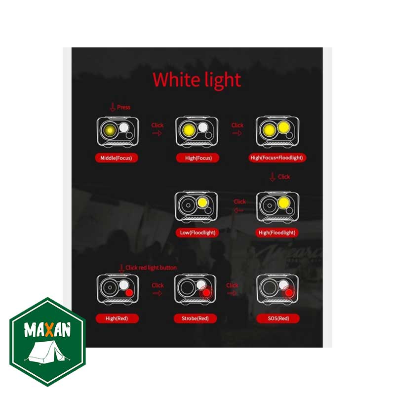 - حالتهای نور: تمرکزی، پخششده، نور قرمز، SOS